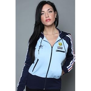 adidas The France 2010 World Cup Track Jacket,Jackets for Women: Model is wearing a size Small Zip-up track jacket with zip pockets and drawcord hood; embroidered adidas logo and France soccer logo on front at opposite sides; zip pocket at chest; striped color detail on sleeves; embroidered design inside of hood and on back; 100% polyester. By adidas